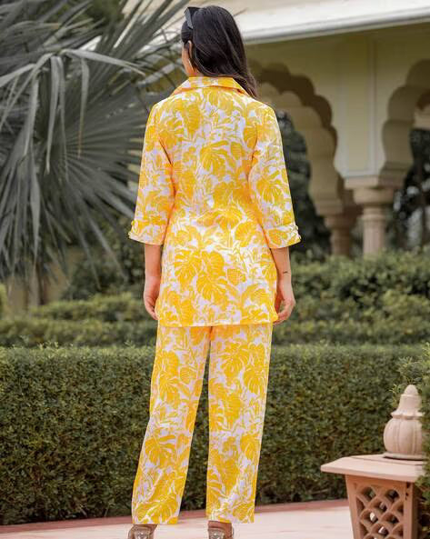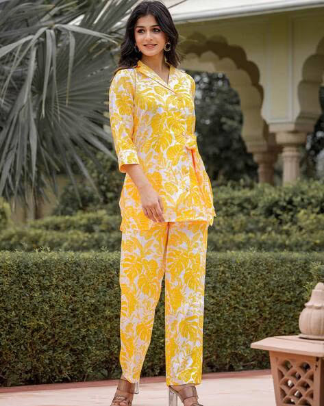 Apne look me layein freshness aur charm is stunning yellow printed cordset ke saath. Pure viscose fabric se bana hua, ye outfit super soft, breathable aur lightweight hai – jo har season me perfect comfort deta hai. Stylish printed top aur matching straight pants ka combo banata hai isse ek classy yet trendy choice for outings, daily wear ya travel.
